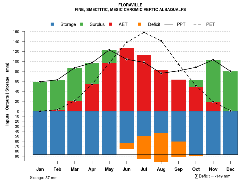 Monthly water balance estimated using a leaky-bucket style model for the FLORAVILLE soil series. Monthly precipitation (PPT) and potential evapotranspiration (PET) have been estimated from the 50th percentile of gridded values (PRISM 1981-2010) overlapping with the extent of SSURGO map units containing each series as a major component. Monthly PET values were estimated using the method of Thornthwaite (1948). These (and other) climatic parameters are calculated with each SSURGO refresh and provided by the fetchOSD function of the soilDB package. Representative water storage values (“AWC” in the figures) were derived from SSURGO by taking the 50th percentile of profile-total water storage (sum[awc_r * horizon thickness]) for each soil series. Note that this representation of “water storage” is based on the average ability of most plants to extract soil water between 15 bar (“permanent wilting point”) and 1/3 bar (“field capacity”) matric potential. Soil moisture state can be roughly interpreted as “dry” when storage is depleted, “moist” when storage is between 0mm and AWC, and “wet” when there is a surplus. Clearly there are a lot of assumptions baked into this kind of monthly water balance. This is still a work in progress.