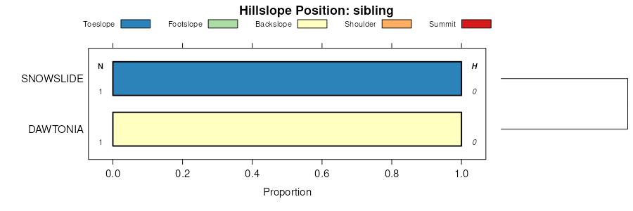 Geomorphic description summaries for the FARVANT series and siblings. Series are sorted according to hierarchical clustering of proportions and relative hydrologic position within an idealized landform (e.g. top to bottom). Most soil series (SSURGO components) are associated with a hillslope position and one or more landform-specific positions: hills, mountain slopes, terraces, and/or flats. Proportions can be interpreted as an aggregate representation of geomorphic membership. The values printed to the left (number of component records) and right (Shannon entropy) of stacked bars can be used to judge the reliability of trends. Small Shannon entropy values suggest relatively consistent geomorphic association, while larger values suggest lack thereof. Source: SSURGO component records .