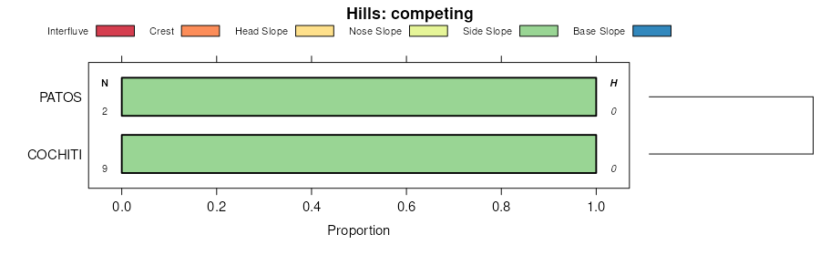 Geomorphic description summaries for the FERNO series and siblings. Series are sorted according to hierarchical clustering of proportions and relative hydrologic position within an idealized landform (e.g. top to bottom). Most soil series (SSURGO components) are associated with a hillslope position and one or more landform-specific positions: hills, mountain slopes, terraces, and/or flats. Proportions can be interpreted as an aggregate representation of geomorphic membership. The values printed to the left (number of component records) and right (Shannon entropy) of stacked bars can be used to judge the reliability of trends. Small Shannon entropy values suggest relatively consistent geomorphic association, while larger values suggest lack thereof. Source: SSURGO component records .
