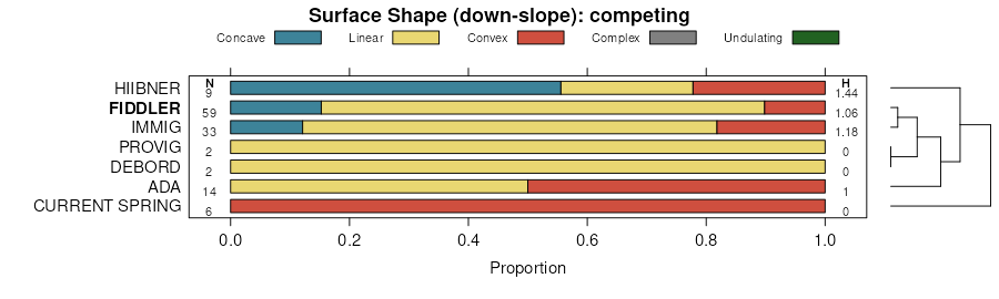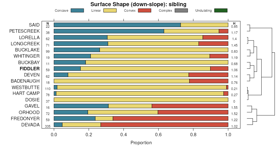 Geomorphic description summaries for the FIDDLER series and competing. Series are sorted according to hierarchical clustering of proportions and relative hydrologic position within an idealized landform (e.g. top to bottom). Most soil series (SSURGO components) are associated with a two-dimensional hillslope position and one or more landform-specific, three-dimensional positions: hills, mountain slopes, terraces, and/or flats. The land surface curvature is described across-slope and down-slope. Proportions can be interpreted as an aggregate representation of geomorphic membership. The values printed to the left (number of component records) and right (Shannon entropy) of stacked bars can be used to judge the reliability of trends. Small Shannon entropy values suggest relatively consistent geomorphic association, while larger values suggest lack thereof. Source: SSURGO component records . Learn more about how these data were prepared.