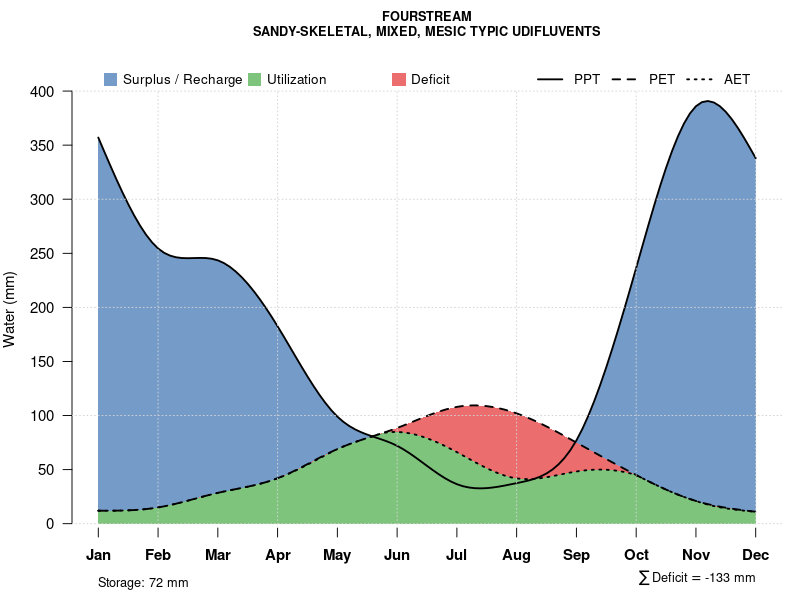 Monthly water balance estimated using a leaky-bucket style model for the FOURSTREAM soil series. Monthly precipitation (PPT) and potential evapotranspiration (PET) have been estimated from the 50th percentile of gridded values (PRISM 1981-2010) overlapping with the extent of SSURGO map units containing each series as a major component. Monthly PET values were estimated using the method of Thornthwaite (1948). These (and other) climatic parameters are calculated with each SSURGO refresh and provided by the fetchOSD function of the soilDB package. Representative water storage values (“AWC” in the figures) were derived from SSURGO by taking the 50th percentile of profile-total water storage (sum[awc_r * horizon thickness]) for each soil series. Note that this representation of “water storage” is based on the average ability of most plants to extract soil water between 15 bar (“permanent wilting point”) and 1/3 bar (“field capacity”) matric potential. Soil moisture state can be roughly interpreted as “dry” when storage is depleted, “moist” when storage is between 0mm and AWC, and “wet” when there is a surplus. Clearly there are a lot of assumptions baked into this kind of monthly water balance. This is still a work in progress.