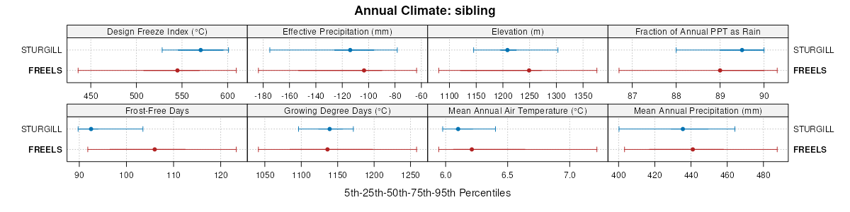Select annual climate data summaries for the FREELS series and competing. Series are sorted according to hierarchical clustering of median values. Source: SSURGO map unit geometry and 1981-2010, 800m PRISM data .