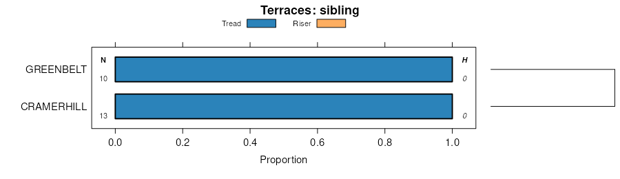 Geomorphic description summaries for the FRESHKILLS series and competing. Series are sorted according to hierarchical clustering of proportions and relative hydrologic position within an idealized landform (e.g. top to bottom). Proportions can be interpreted as an aggregate representation of geomorphic membership. Most soil series (SSURGO components) are associated with a hillslope position and one or more landform-specific positions: hills, mountain slopes, terraces, and/or flats. The values printed to the left (number of component records) and right (Shannon entropy) of stacked bars can be used to judge the reliability of trends. Shannon entropy values close to 0 represent soil series with relatively consistent geomorphic association, while values close to 1 suggest lack thereof. Source: SSURGO component records .