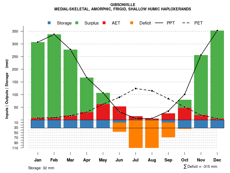 Monthly water balance estimated using a leaky-bucket style model for the GIBSONVILLE soil series. Monthly precipitation (PPT) and potential evapotranspiration (PET) have been estimated from the 50th percentile of gridded values (PRISM 1981-2010) overlapping with the extent of SSURGO map units containing each series as a major component. Monthly PET values were estimated using the method of Thornthwaite (1948). These (and other) climatic parameters are calculated with each SSURGO refresh and provided by the fetchOSD function of the soilDB package. Representative water storage values (“AWC” in the figures) were derived from SSURGO by taking the 50th percentile of profile-total water storage (sum[awc_r * horizon thickness]) for each soil series. Note that this representation of “water storage” is based on the average ability of most plants to extract soil water between 15 bar (“permanent wilting point”) and 1/3 bar (“field capacity”) matric potential. Soil moisture state can be roughly interpreted as “dry” when storage is depleted, “moist” when storage is between 0mm and AWC, and “wet” when there is a surplus. Clearly there are a lot of assumptions baked into this kind of monthly water balance. This is still a work in progress.