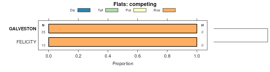 Geomorphic description summaries for the GALVESTON series and siblings. Series are sorted according to hierarchical clustering of proportions and relative hydrologic position within an idealized landform (e.g. top to bottom). Most soil series (SSURGO components) are associated with a hillslope position and one or more landform-specific positions: hills, mountain slopes, terraces, and/or flats. Proportions can be interpreted as an aggregate representation of geomorphic membership. The values printed to the left (number of component records) and right (Shannon entropy) of stacked bars can be used to judge the reliability of trends. Small Shannon entropy values suggest relatively consistent geomorphic association, while larger values suggest lack thereof. Source: SSURGO component records .