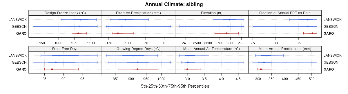 Select annual climate data summaries for the GARO series and competing. Series are sorted according to hierarchical clustering of median values. Source: SSURGO map unit geometry and 1981-2010, 800m PRISM data .