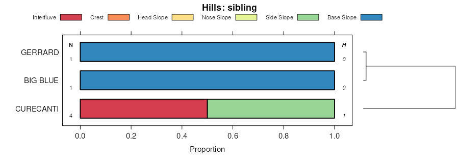 Geomorphic description summaries for the GAS CREEK series and siblings. Series are sorted according to hierarchical clustering of proportions and relative hydrologic position within an idealized landform (e.g. top to bottom). Most soil series (SSURGO components) are associated with a hillslope position and one or more landform-specific positions: hills, mountain slopes, terraces, and/or flats. Proportions can be interpreted as an aggregate representation of geomorphic membership. The values printed to the left (number of component records) and right (Shannon entropy) of stacked bars can be used to judge the reliability of trends. Small Shannon entropy values suggest relatively consistent geomorphic association, while larger values suggest lack thereof. Source: SSURGO component records .