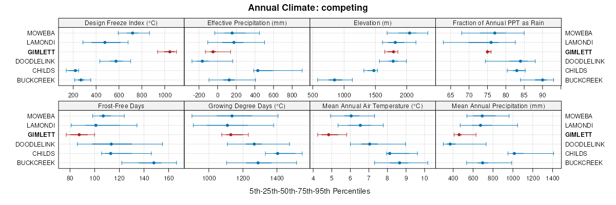 Select annual climate data summaries for the GIMLETT series and competing. Series are sorted according to hierarchical clustering of median values. Source: SSURGO map unit geometry and 1981-2010, 800m PRISM data .
