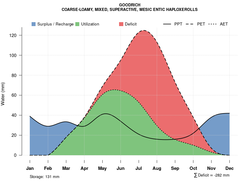 Monthly water balance estimated using a leaky-bucket style model for the GOODRICH soil series. Monthly precipitation (PPT) and potential evapotranspiration (PET) have been estimated from the 50th percentile of gridded values (PRISM 1981-2010) overlapping with the extent of SSURGO map units containing each series as a major component. Monthly PET values were estimated using the method of Thornthwaite (1948). These (and other) climatic parameters are calculated with each SSURGO refresh and provided by the fetchOSD function of the soilDB package. Representative water storage values (“AWC” in the figures) were derived from SSURGO by taking the 50th percentile of profile-total water storage (sum[awc_r * horizon thickness]) for each soil series. Note that this representation of “water storage” is based on the average ability of most plants to extract soil water between 15 bar (“permanent wilting point”) and 1/3 bar (“field capacity”) matric potential. Soil moisture state can be roughly interpreted as “dry” when storage is depleted, “moist” when storage is between 0mm and AWC, and “wet” when there is a surplus. Clearly there are a lot of assumptions baked into this kind of monthly water balance. This is still a work in progress.
