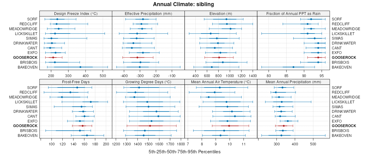 Select annual climate data summaries for the GOOSEROCK series and competing. Series are sorted according to hierarchical clustering of median values. Source: SSURGO map unit geometry and 1981-2010, 800m PRISM data .