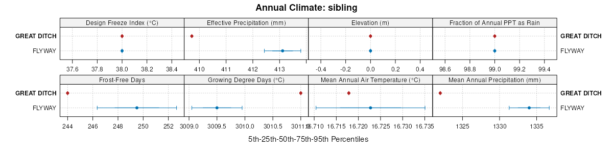 Select annual climate data summaries for the GREAT DITCH series and competing. Series are sorted according to hierarchical clustering of median values. Source: SSURGO map unit geometry and 1981-2010, 800m PRISM data .