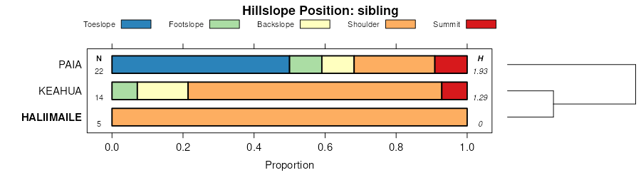 Geomorphic description summaries for the HALIIMAILE series and siblings. Series are sorted according to hierarchical clustering of proportions and relative hydrologic position within an idealized landform (e.g. top to bottom). Most soil series (SSURGO components) are associated with a hillslope position and one or more landform-specific positions: hills, mountain slopes, terraces, and/or flats. Proportions can be interpreted as an aggregate representation of geomorphic membership. The values printed to the left (number of component records) and right (Shannon entropy) of stacked bars can be used to judge the reliability of trends. Small Shannon entropy values suggest relatively consistent geomorphic association, while larger values suggest lack thereof. Source: SSURGO component records .