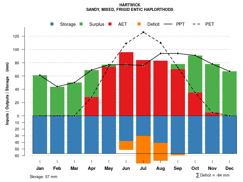 Monthly water balance estimated using a leaky-bucket style model for the HARTWICK soil series. Monthly precipitation (PPT) and potential evapotranspiration (PET) have been estimated from the 50th percentile of gridded values (PRISM 1981-2010) overlapping with the extent of SSURGO map units containing each series as a major component. Monthly PET values were estimated using the method of Thornthwaite (1948). These (and other) climatic parameters are calculated with each SSURGO refresh and provided by the fetchOSD function of the soilDB package. Representative water storage values (“AWC” in the figures) were derived from SSURGO by taking the 50th percentile of profile-total water storage (sum[awc_r * horizon thickness]) for each soil series. Note that this representation of “water storage” is based on the average ability of most plants to extract soil water between 15 bar (“permanent wilting point”) and 1/3 bar (“field capacity”) matric potential. Soil moisture state can be roughly interpreted as “dry” when storage is depleted, “moist” when storage is between 0mm and AWC, and “wet” when there is a surplus. Clearly there are a lot of assumptions baked into this kind of monthly water balance. This is still a work in progress.