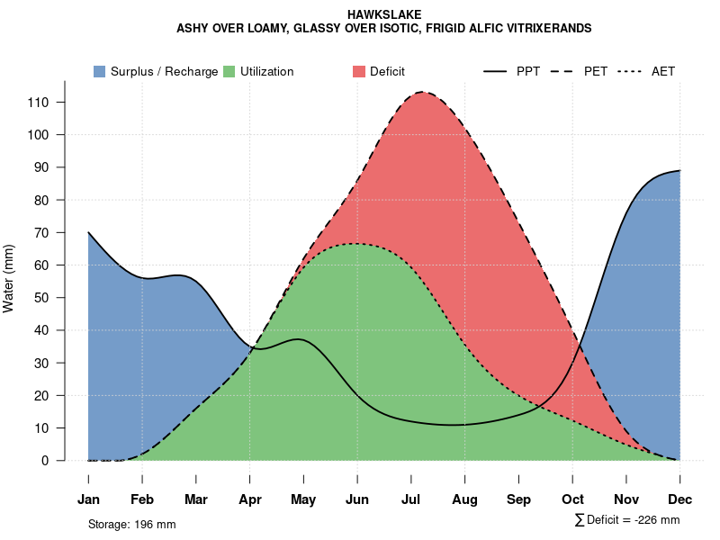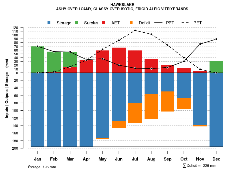 Monthly water balance estimated using a leaky-bucket style model for the HAWKSLAKE soil series. Monthly precipitation (PPT) and potential evapotranspiration (PET) have been estimated from the 50th percentile of gridded values (PRISM 1981-2010) overlapping with the extent of SSURGO map units containing each series as a major component. Monthly PET values were estimated using the method of Thornthwaite (1948). These (and other) climatic parameters are calculated with each SSURGO refresh and provided by the fetchOSD function of the soilDB package. Representative water storage values (“AWC” in the figures) were derived from SSURGO by taking the 50th percentile of profile-total water storage (sum[awc_r * horizon thickness]) for each soil series. Note that this representation of “water storage” is based on the average ability of most plants to extract soil water between 15 bar (“permanent wilting point”) and 1/3 bar (“field capacity”) matric potential. Soil moisture state can be roughly interpreted as “dry” when storage is depleted, “moist” when storage is between 0mm and AWC, and “wet” when there is a surplus. Clearly there are a lot of assumptions baked into this kind of monthly water balance. This is still a work in progress.