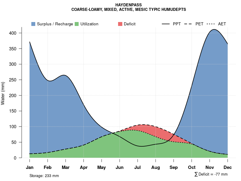 Monthly water balance estimated using a leaky-bucket style model for the HAYDENPASS soil series. Monthly precipitation (PPT) and potential evapotranspiration (PET) have been estimated from the 50th percentile of gridded values (PRISM 1981-2010) overlapping with the extent of SSURGO map units containing each series as a major component. Monthly PET values were estimated using the method of Thornthwaite (1948). These (and other) climatic parameters are calculated with each SSURGO refresh and provided by the fetchOSD function of the soilDB package. Representative water storage values (“AWC” in the figures) were derived from SSURGO by taking the 50th percentile of profile-total water storage (sum[awc_r * horizon thickness]) for each soil series. Note that this representation of “water storage” is based on the average ability of most plants to extract soil water between 15 bar (“permanent wilting point”) and 1/3 bar (“field capacity”) matric potential. Soil moisture state can be roughly interpreted as “dry” when storage is depleted, “moist” when storage is between 0mm and AWC, and “wet” when there is a surplus. Clearly there are a lot of assumptions baked into this kind of monthly water balance. This is still a work in progress.