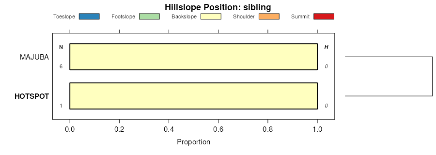 Geomorphic description summaries for the HOTSPOT series and siblings. Series are sorted according to hierarchical clustering of proportions and relative hydrologic position within an idealized landform (e.g. top to bottom). Most soil series (SSURGO components) are associated with a hillslope position and one or more landform-specific positions: hills, mountain slopes, terraces, and/or flats. Proportions can be interpreted as an aggregate representation of geomorphic membership. The values printed to the left (number of component records) and right (Shannon entropy) of stacked bars can be used to judge the reliability of trends. Small Shannon entropy values suggest relatively consistent geomorphic association, while larger values suggest lack thereof. Source: SSURGO component records .