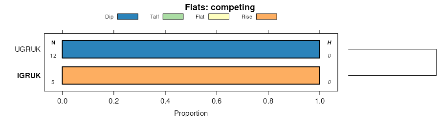 Geomorphic description summaries for the IGRUK series and siblings. Series are sorted according to hierarchical clustering of proportions and relative hydrologic position within an idealized landform (e.g. top to bottom). Most soil series (SSURGO components) are associated with a hillslope position and one or more landform-specific positions: hills, mountain slopes, terraces, and/or flats. Proportions can be interpreted as an aggregate representation of geomorphic membership. The values printed to the left (number of component records) and right (Shannon entropy) of stacked bars can be used to judge the reliability of trends. Small Shannon entropy values suggest relatively consistent geomorphic association, while larger values suggest lack thereof. Source: SSURGO component records .