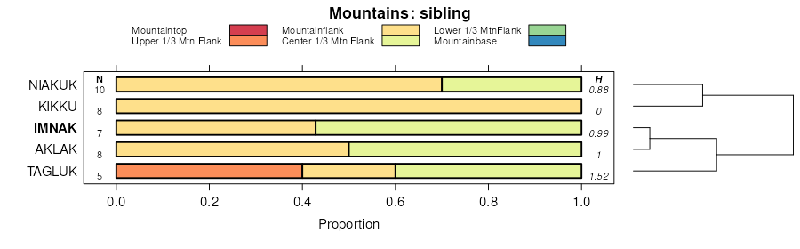 Geomorphic description summaries for the IMNAK series and siblings. Series are sorted according to hierarchical clustering of proportions and relative hydrologic position within an idealized landform (e.g. top to bottom). Most soil series (SSURGO components) are associated with a hillslope position and one or more landform-specific positions: hills, mountain slopes, terraces, and/or flats. Proportions can be interpreted as an aggregate representation of geomorphic membership. The values printed to the left (number of component records) and right (Shannon entropy) of stacked bars can be used to judge the reliability of trends. Small Shannon entropy values suggest relatively consistent geomorphic association, while larger values suggest lack thereof. Source: SSURGO component records .