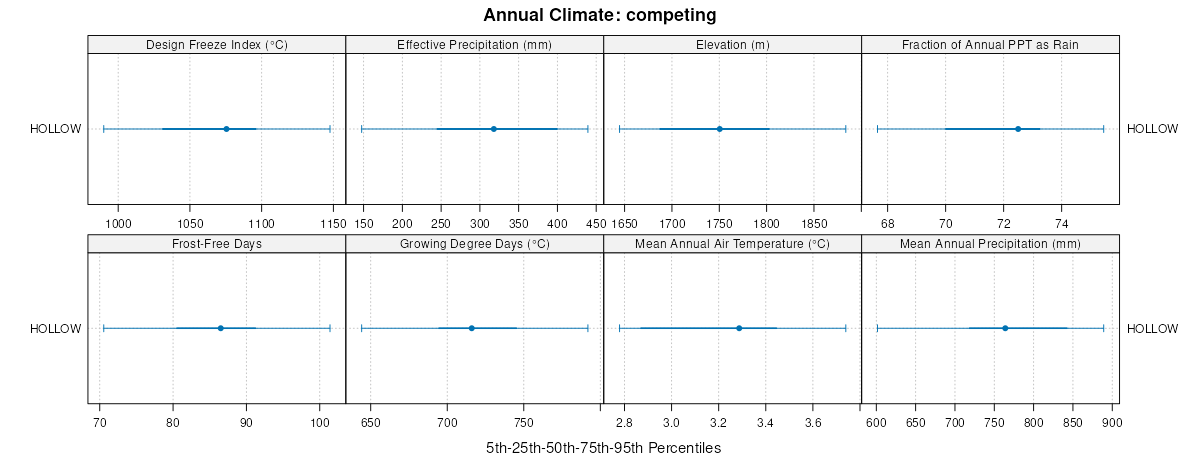 Select annual climate data summaries for the IRONCREEK series and competing. Series are sorted according to hierarchical clustering of median values. Source: SSURGO map unit geometry and 1981-2010, 800m PRISM data .