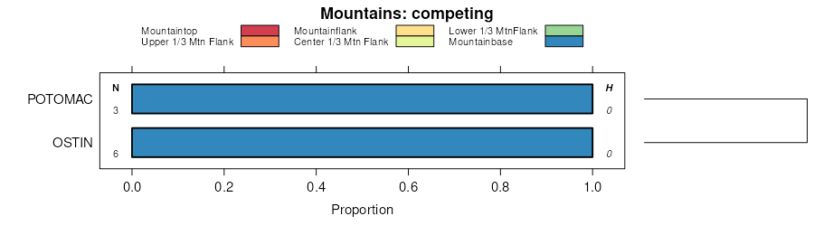 Geomorphic description summaries for the JUNO series and competing. Series are sorted according to hierarchical clustering of proportions and relative hydrologic position within an idealized landform (e.g. top to bottom). Proportions can be interpreted as an aggregate representation of geomorphic membership. Most soil series (SSURGO components) are associated with a hillslope position and one or more landform-specific positions: hills, mountain slopes, terraces, and/or flats. The values printed to the left (number of component records) and right (Shannon entropy) of stacked bars can be used to judge the reliability of trends. Shannon entropy values close to 0 represent soil series with relatively consistent geomorphic association, while values close to 1 suggest lack thereof. Source: SSURGO component records .