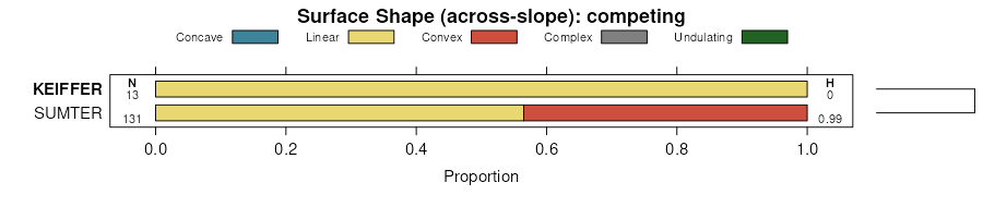 Geomorphic description summaries for the KEIFFER series and competing. Series are sorted according to hierarchical clustering of proportions and relative hydrologic position within an idealized landform (e.g. top to bottom). Most soil series (SSURGO components) are associated with a two-dimensional hillslope position and one or more landform-specific, three-dimensional positions: hills, mountain slopes, terraces, and/or flats. The land surface curvature is described across-slope and down-slope. Proportions can be interpreted as an aggregate representation of geomorphic membership. The values printed to the left (number of component records) and right (Shannon entropy) of stacked bars can be used to judge the reliability of trends. Small Shannon entropy values suggest relatively consistent geomorphic association, while larger values suggest lack thereof. Source: SSURGO component records . Learn more about how these data were prepared.