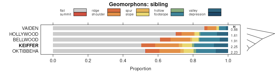 Geomorphons summaries for the KEIFFER series and siblings. Series are sorted according to hierarchical clustering of proportions and relative hydrologic position within an idealized landform (e.g. top to bottom). Source: SSURGO map unit delineations, component records, and USGS 30m digital elevation model . Learn more about how these data were prepared.