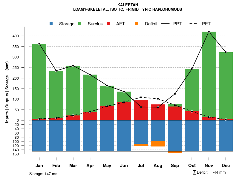 Monthly water balance estimated using a leaky-bucket style model for the KALEETAN soil series. Monthly precipitation (PPT) and potential evapotranspiration (PET) have been estimated from the 50th percentile of gridded values (PRISM 1981-2010) overlapping with the extent of SSURGO map units containing each series as a major component. Monthly PET values were estimated using the method of Thornthwaite (1948). These (and other) climatic parameters are calculated with each SSURGO refresh and provided by the fetchOSD function of the soilDB package. Representative water storage values (“AWC” in the figures) were derived from SSURGO by taking the 50th percentile of profile-total water storage (sum[awc_r * horizon thickness]) for each soil series. Note that this representation of “water storage” is based on the average ability of most plants to extract soil water between 15 bar (“permanent wilting point”) and 1/3 bar (“field capacity”) matric potential. Soil moisture state can be roughly interpreted as “dry” when storage is depleted, “moist” when storage is between 0mm and AWC, and “wet” when there is a surplus. Clearly there are a lot of assumptions baked into this kind of monthly water balance. This is still a work in progress.