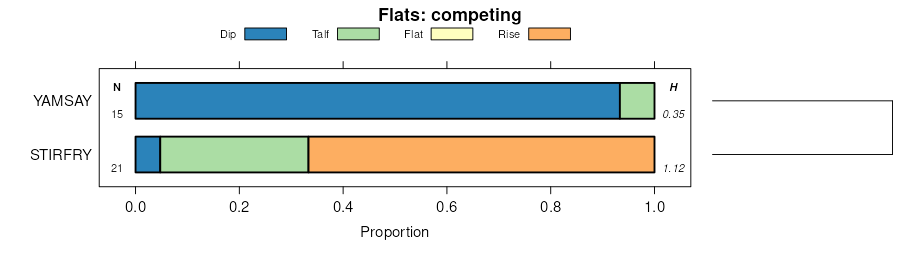 Geomorphic description summaries for the KARHEEN series and competing. Series are sorted according to hierarchical clustering of proportions and relative hydrologic position within an idealized landform (e.g. top to bottom). Proportions can be interpreted as an aggregate representation of geomorphic membership. Most soil series (SSURGO components) are associated with a hillslope position and one or more landform-specific positions: hills, mountain slopes, terraces, and/or flats. The values printed to the left (number of component records) and right (Shannon entropy) of stacked bars can be used to judge the reliability of trends. Shannon entropy values close to 0 represent soil series with relatively consistent geomorphic association, while values close to 1 suggest lack thereof. Source: SSURGO component records .