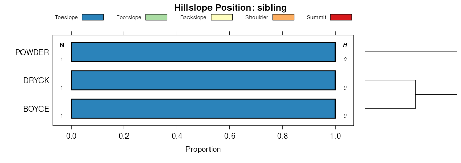 Geomorphic description summaries for the KIMBERLY series and competing. Series are sorted according to hierarchical clustering of proportions and relative hydrologic position within an idealized landform (e.g. top to bottom). Proportions can be interpreted as an aggregate representation of geomorphic membership. Most soil series (SSURGO components) are associated with a hillslope position and one or more landform-specific positions: hills, mountain slopes, terraces, and/or flats. The values printed to the left (number of component records) and right (Shannon entropy) of stacked bars can be used to judge the reliability of trends. Shannon entropy values close to 0 represent soil series with relatively consistent geomorphic association, while values close to 1 suggest lack thereof. Source: SSURGO component records .