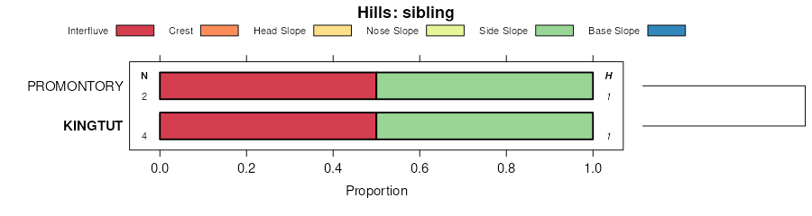 Geomorphic description summaries for the KINGTUT series and siblings. Series are sorted according to hierarchical clustering of proportions and relative hydrologic position within an idealized landform (e.g. top to bottom). Most soil series (SSURGO components) are associated with a hillslope position and one or more landform-specific positions: hills, mountain slopes, terraces, and/or flats. Proportions can be interpreted as an aggregate representation of geomorphic membership. The values printed to the left (number of component records) and right (Shannon entropy) of stacked bars can be used to judge the reliability of trends. Small Shannon entropy values suggest relatively consistent geomorphic association, while larger values suggest lack thereof. Source: SSURGO component records .