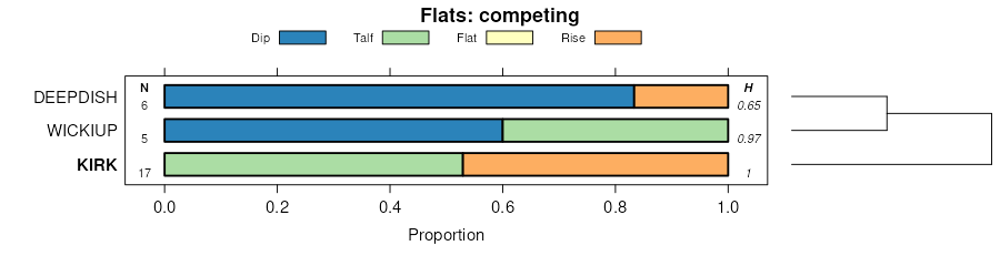 Geomorphic description summaries for the KIRK series and competing. Series are sorted according to hierarchical clustering of proportions and relative hydrologic position within an idealized landform (e.g. top to bottom). Proportions can be interpreted as an aggregate representation of geomorphic membership. Most soil series (SSURGO components) are associated with a hillslope position and one or more landform-specific positions: hills, mountain slopes, terraces, and/or flats. The values printed to the left (number of component records) and right (Shannon entropy) of stacked bars can be used to judge the reliability of trends. Shannon entropy values close to 0 represent soil series with relatively consistent geomorphic association, while values close to 1 suggest lack thereof. Source: SSURGO component records .