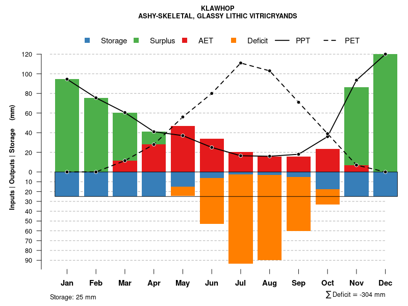 Monthly water balance estimated using a leaky-bucket style model for the KLAWHOP soil series. Monthly precipitation (PPT) and potential evapotranspiration (PET) have been estimated from the 50th percentile of gridded values (PRISM 1981-2010) overlapping with the extent of SSURGO map units containing each series as a major component. Monthly PET values were estimated using the method of Thornthwaite (1948). These (and other) climatic parameters are calculated with each SSURGO refresh and provided by the fetchOSD function of the soilDB package. Representative water storage values (“AWC” in the figures) were derived from SSURGO by taking the 50th percentile of profile-total water storage (sum[awc_r * horizon thickness]) for each soil series. Note that this representation of “water storage” is based on the average ability of most plants to extract soil water between 15 bar (“permanent wilting point”) and 1/3 bar (“field capacity”) matric potential. Soil moisture state can be roughly interpreted as “dry” when storage is depleted, “moist” when storage is between 0mm and AWC, and “wet” when there is a surplus. Clearly there are a lot of assumptions baked into this kind of monthly water balance. This is still a work in progress.