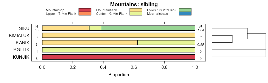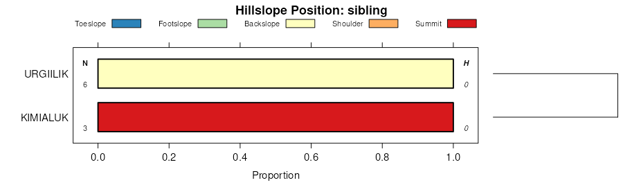 Geomorphic description summaries for the KUNJIK series and siblings. Series are sorted according to hierarchical clustering of proportions and relative hydrologic position within an idealized landform (e.g. top to bottom). Most soil series (SSURGO components) are associated with a hillslope position and one or more landform-specific positions: hills, mountain slopes, terraces, and/or flats. Proportions can be interpreted as an aggregate representation of geomorphic membership. The values printed to the left (number of component records) and right (Shannon entropy) of stacked bars can be used to judge the reliability of trends. Small Shannon entropy values suggest relatively consistent geomorphic association, while larger values suggest lack thereof. Source: SSURGO component records .