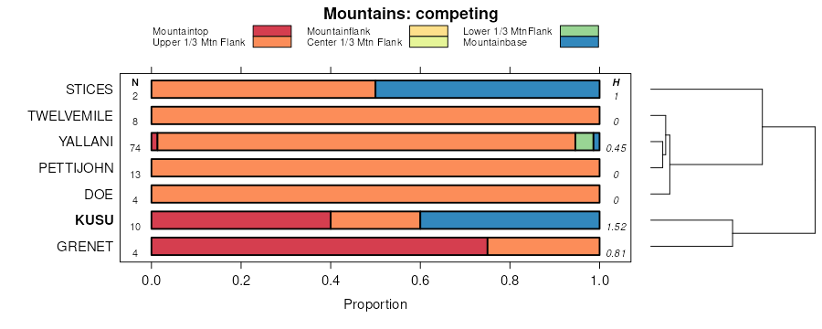 Geomorphic description summaries for the KUSU series and competing. Series are sorted according to hierarchical clustering of proportions and relative hydrologic position within an idealized landform (e.g. top to bottom). Proportions can be interpreted as an aggregate representation of geomorphic membership. Most soil series (SSURGO components) are associated with a hillslope position and one or more landform-specific positions: hills, mountain slopes, terraces, and/or flats. The values printed to the left (number of component records) and right (Shannon entropy) of stacked bars can be used to judge the reliability of trends. Shannon entropy values close to 0 represent soil series with relatively consistent geomorphic association, while values close to 1 suggest lack thereof. Source: SSURGO component records .