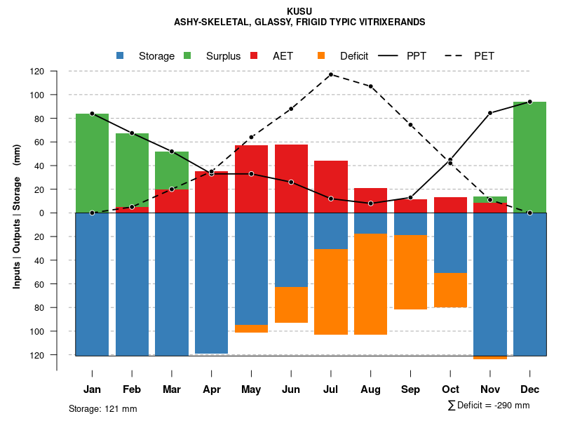 Monthly water balance estimated using a leaky-bucket style model for the KUSU soil series. Monthly precipitation (PPT) and potential evapotranspiration (PET) have been estimated from the 50th percentile of gridded values (PRISM 1981-2010) overlapping with the extent of SSURGO map units containing each series as a major component. Monthly PET values were estimated using the method of Thornthwaite (1948). These (and other) climatic parameters are calculated with each SSURGO refresh and provided by the fetchOSD function of the soilDB package. Representative water storage values (“AWC” in the figures) were derived from SSURGO by taking the 50th percentile of profile-total water storage (sum[awc_r * horizon thickness]) for each soil series. Note that this representation of “water storage” is based on the average ability of most plants to extract soil water between 15 bar (“permanent wilting point”) and 1/3 bar (“field capacity”) matric potential. Soil moisture state can be roughly interpreted as “dry” when storage is depleted, “moist” when storage is between 0mm and AWC, and “wet” when there is a surplus. Clearly there are a lot of assumptions baked into this kind of monthly water balance. This is still a work in progress.
