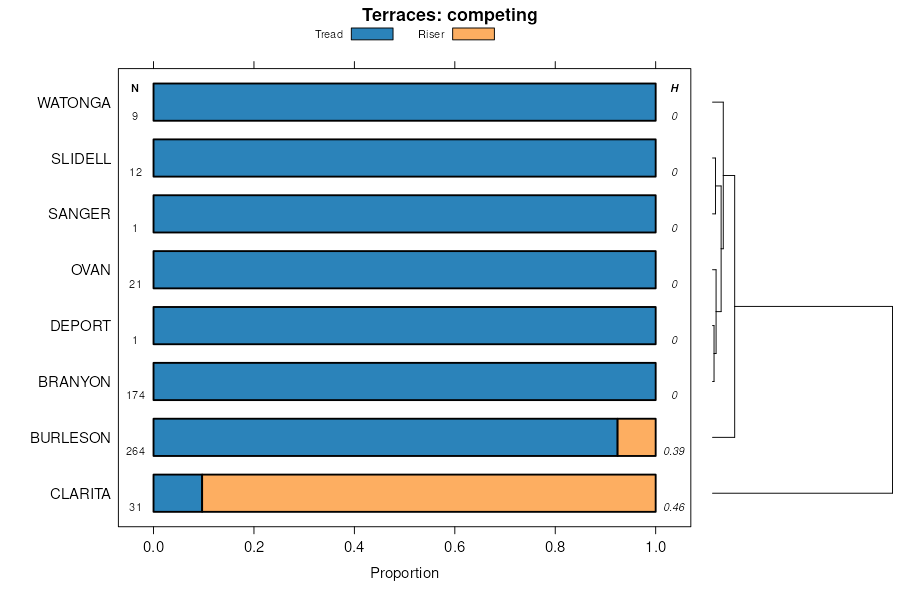 Geomorphic description summaries for the LAZARE series and competing. Series are sorted according to hierarchical clustering of proportions and relative hydrologic position within an idealized landform (e.g. top to bottom). Proportions can be interpreted as an aggregate representation of geomorphic membership. Most soil series (SSURGO components) are associated with a hillslope position and one or more landform-specific positions: hills, mountain slopes, terraces, and/or flats. The values printed to the left (number of component records) and right (Shannon entropy) of stacked bars can be used to judge the reliability of trends. Shannon entropy values close to 0 represent soil series with relatively consistent geomorphic association, while values close to 1 suggest lack thereof. Source: SSURGO component records .