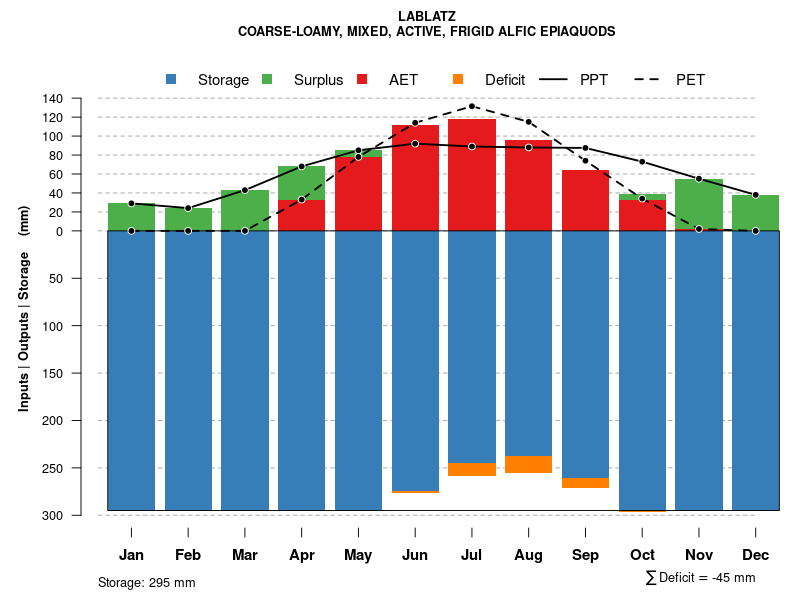Monthly water balance estimated using a leaky-bucket style model for the LABLATZ soil series. Monthly precipitation (PPT) and potential evapotranspiration (PET) have been estimated from the 50th percentile of gridded values (PRISM 1981-2010) overlapping with the extent of SSURGO map units containing each series as a major component. Monthly PET values were estimated using the method of Thornthwaite (1948). These (and other) climatic parameters are calculated with each SSURGO refresh and provided by the fetchOSD function of the soilDB package. Representative water storage values (“AWC” in the figures) were derived from SSURGO by taking the 50th percentile of profile-total water storage (sum[awc_r * horizon thickness]) for each soil series. Note that this representation of “water storage” is based on the average ability of most plants to extract soil water between 15 bar (“permanent wilting point”) and 1/3 bar (“field capacity”) matric potential. Soil moisture state can be roughly interpreted as “dry” when storage is depleted, “moist” when storage is between 0mm and AWC, and “wet” when there is a surplus. Clearly there are a lot of assumptions baked into this kind of monthly water balance. This is still a work in progress.