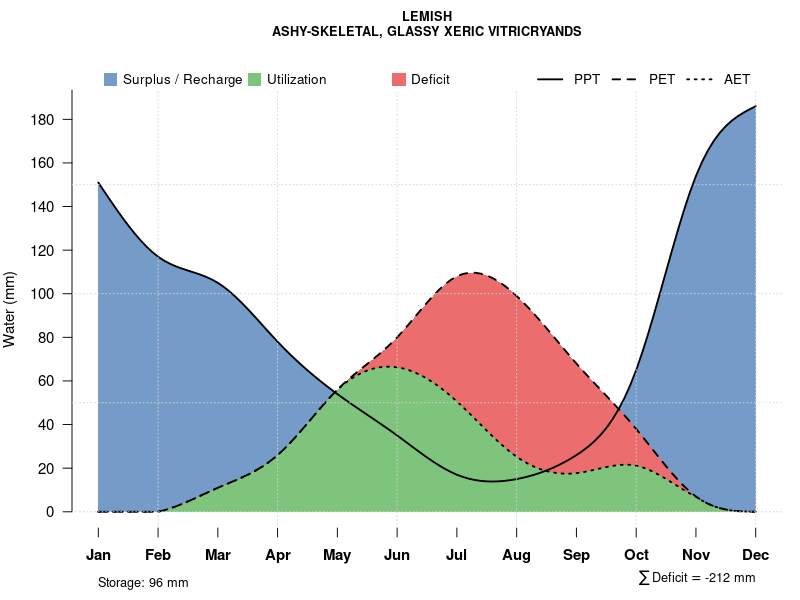 Monthly water balance estimated using a leaky-bucket style model for the LEMISH soil series. Monthly precipitation (PPT) and potential evapotranspiration (PET) have been estimated from the 50th percentile of gridded values (PRISM 1981-2010) overlapping with the extent of SSURGO map units containing each series as a major component. Monthly PET values were estimated using the method of Thornthwaite (1948). These (and other) climatic parameters are calculated with each SSURGO refresh and provided by the fetchOSD function of the soilDB package. Representative water storage values (“AWC” in the figures) were derived from SSURGO by taking the 50th percentile of profile-total water storage (sum[awc_r * horizon thickness]) for each soil series. Note that this representation of “water storage” is based on the average ability of most plants to extract soil water between 15 bar (“permanent wilting point”) and 1/3 bar (“field capacity”) matric potential. Soil moisture state can be roughly interpreted as “dry” when storage is depleted, “moist” when storage is between 0mm and AWC, and “wet” when there is a surplus. Clearly there are a lot of assumptions baked into this kind of monthly water balance. This is still a work in progress.