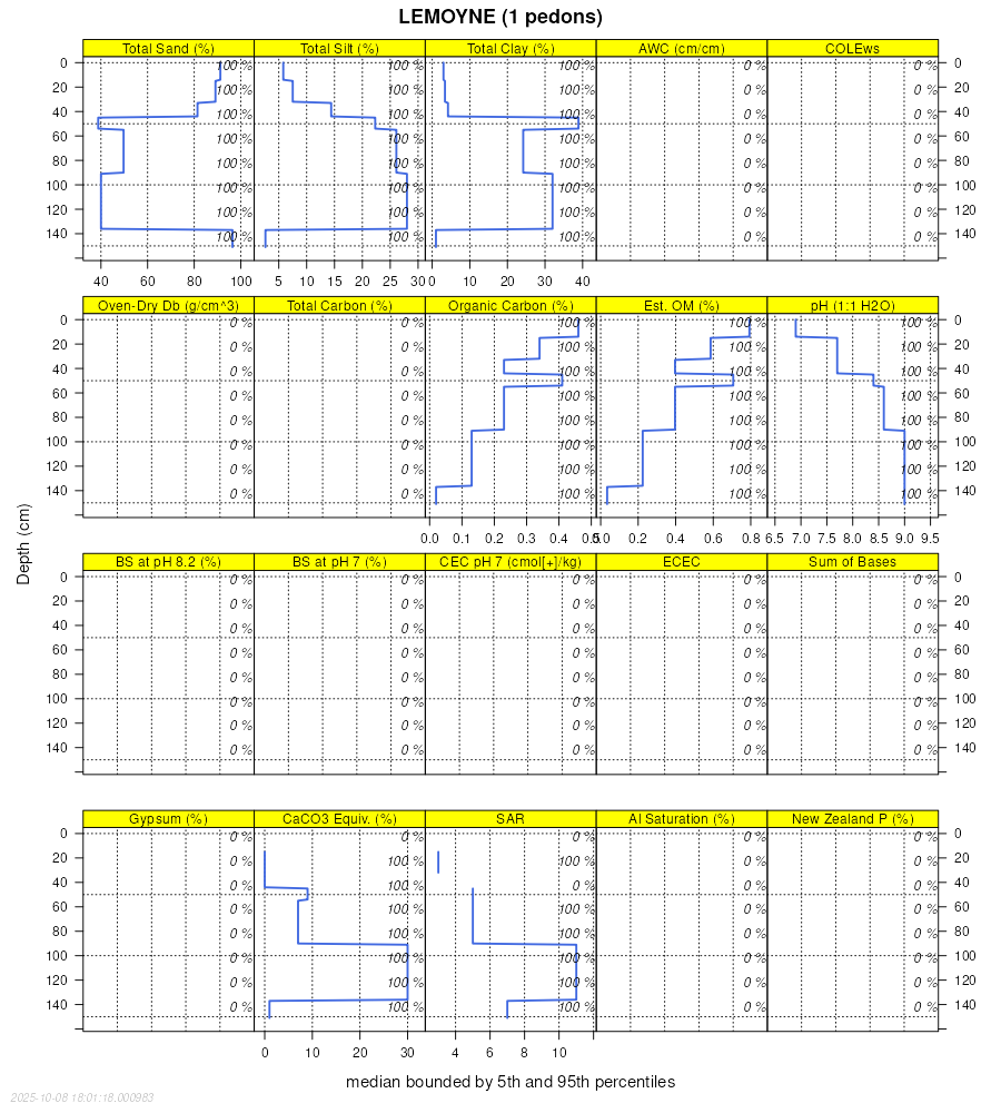 Aggregate lab data for the LEMOYNE soil series. This aggregation is based on all pedons with a current taxon name of LEMOYNE, and applied along 1-cm thick depth slices. Solid lines are the slice-wise median, bounded on either side by the interval defined by the slice-wise 5th and 95th percentiles. The median is the value that splits the data in half. Five percent of the data are less than the 5th percentile, and five percent of the data are greater than the 95th percentile. Values along the right hand side y-axis describe the proportion of pedon data that contribute to aggregate values at this depth. For example, a value of "90%" at 25cm means that 90% of the pedons correlated to LEMOYNE were used in the calculation. Source: KSSL snapshot . Methods used to assemble the KSSL snapshot used by SoilWeb / SDE