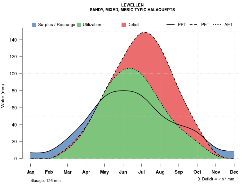Monthly water balance estimated using a leaky-bucket style model for the LEWELLEN soil series. Monthly precipitation (PPT) and potential evapotranspiration (PET) have been estimated from the 50th percentile of gridded values (PRISM 1981-2010) overlapping with the extent of SSURGO map units containing each series as a major component. Monthly PET values were estimated using the method of Thornthwaite (1948). These (and other) climatic parameters are calculated with each SSURGO refresh and provided by the fetchOSD function of the soilDB package. Representative water storage values (“AWC” in the figures) were derived from SSURGO by taking the 50th percentile of profile-total water storage (sum[awc_r * horizon thickness]) for each soil series. Note that this representation of “water storage” is based on the average ability of most plants to extract soil water between 15 bar (“permanent wilting point”) and 1/3 bar (“field capacity”) matric potential. Soil moisture state can be roughly interpreted as “dry” when storage is depleted, “moist” when storage is between 0mm and AWC, and “wet” when there is a surplus. Clearly there are a lot of assumptions baked into this kind of monthly water balance. This is still a work in progress.