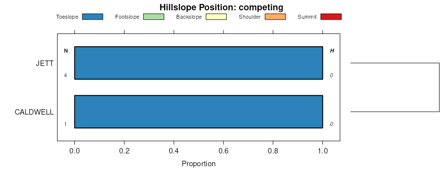 Geomorphic description summaries for the LOUPENCE series and competing. Series are sorted according to hierarchical clustering of proportions and relative hydrologic position within an idealized landform (e.g. top to bottom). Proportions can be interpreted as an aggregate representation of geomorphic membership. Most soil series (SSURGO components) are associated with a hillslope position and one or more landform-specific positions: hills, mountain slopes, terraces, and/or flats. The values printed to the left (number of component records) and right (Shannon entropy) of stacked bars can be used to judge the reliability of trends. Shannon entropy values close to 0 represent soil series with relatively consistent geomorphic association, while values close to 1 suggest lack thereof. Source: SSURGO component records .