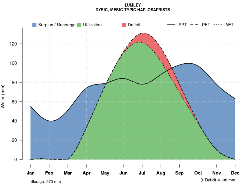 Monthly water balance estimated using a leaky-bucket style model for the LUMLEY soil series. Monthly precipitation (PPT) and potential evapotranspiration (PET) have been estimated from the 50th percentile of gridded values (PRISM 1981-2010) overlapping with the extent of SSURGO map units containing each series as a major component. Monthly PET values were estimated using the method of Thornthwaite (1948). These (and other) climatic parameters are calculated with each SSURGO refresh and provided by the fetchOSD function of the soilDB package. Representative water storage values (“AWC” in the figures) were derived from SSURGO by taking the 50th percentile of profile-total water storage (sum[awc_r * horizon thickness]) for each soil series. Note that this representation of “water storage” is based on the average ability of most plants to extract soil water between 15 bar (“permanent wilting point”) and 1/3 bar (“field capacity”) matric potential. Soil moisture state can be roughly interpreted as “dry” when storage is depleted, “moist” when storage is between 0mm and AWC, and “wet” when there is a surplus. Clearly there are a lot of assumptions baked into this kind of monthly water balance. This is still a work in progress.