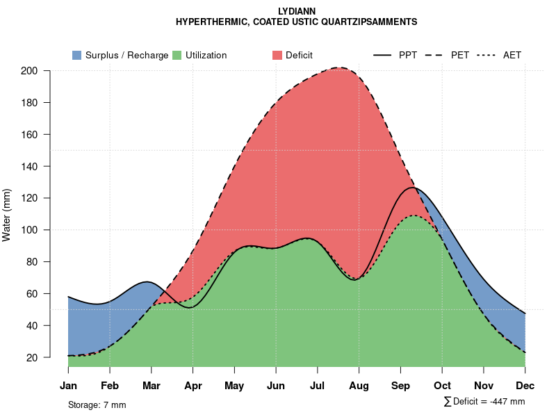 Monthly water balance estimated using a leaky-bucket style model for the LYDIANN soil series. Monthly precipitation (PPT) and potential evapotranspiration (PET) have been estimated from the 50th percentile of gridded values (PRISM 1981-2010) overlapping with the extent of SSURGO map units containing each series as a major component. Monthly PET values were estimated using the method of Thornthwaite (1948). These (and other) climatic parameters are calculated with each SSURGO refresh and provided by the fetchOSD function of the soilDB package. Representative water storage values (“AWC” in the figures) were derived from SSURGO by taking the 50th percentile of profile-total water storage (sum[awc_r * horizon thickness]) for each soil series. Note that this representation of “water storage” is based on the average ability of most plants to extract soil water between 15 bar (“permanent wilting point”) and 1/3 bar (“field capacity”) matric potential. Soil moisture state can be roughly interpreted as “dry” when storage is depleted, “moist” when storage is between 0mm and AWC, and “wet” when there is a surplus. Clearly there are a lot of assumptions baked into this kind of monthly water balance. This is still a work in progress.