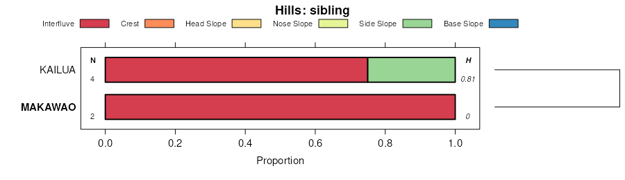 Geomorphic description summaries for the MAKAWAO series and siblings. Series are sorted according to hierarchical clustering of proportions and relative hydrologic position within an idealized landform (e.g. top to bottom). Most soil series (SSURGO components) are associated with a hillslope position and one or more landform-specific positions: hills, mountain slopes, terraces, and/or flats. Proportions can be interpreted as an aggregate representation of geomorphic membership. The values printed to the left (number of component records) and right (Shannon entropy) of stacked bars can be used to judge the reliability of trends. Small Shannon entropy values suggest relatively consistent geomorphic association, while larger values suggest lack thereof. Source: SSURGO component records .
