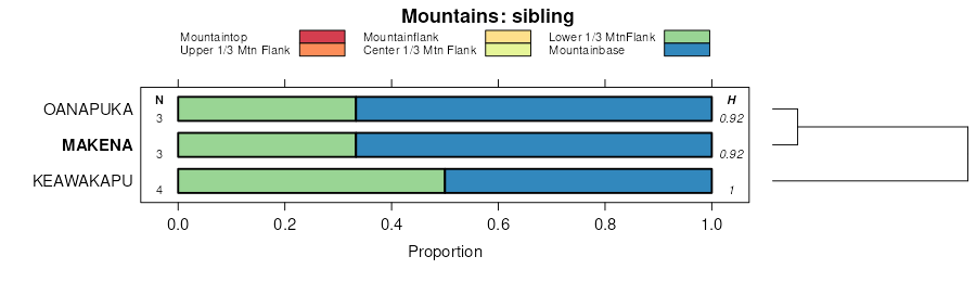 Geomorphic description summaries for the MAKENA series and siblings. Series are sorted according to hierarchical clustering of proportions and relative hydrologic position within an idealized landform (e.g. top to bottom). Most soil series (SSURGO components) are associated with a hillslope position and one or more landform-specific positions: hills, mountain slopes, terraces, and/or flats. Proportions can be interpreted as an aggregate representation of geomorphic membership. The values printed to the left (number of component records) and right (Shannon entropy) of stacked bars can be used to judge the reliability of trends. Small Shannon entropy values suggest relatively consistent geomorphic association, while larger values suggest lack thereof. Source: SSURGO component records .