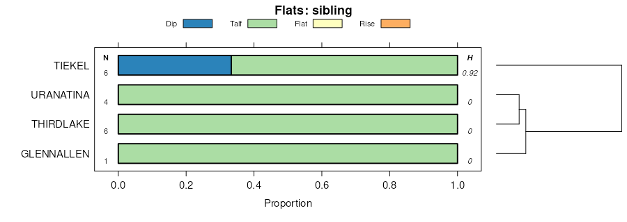 Geomorphic description summaries for the MANKER series and siblings. Series are sorted according to hierarchical clustering of proportions and relative hydrologic position within an idealized landform (e.g. top to bottom). Most soil series (SSURGO components) are associated with a hillslope position and one or more landform-specific positions: hills, mountain slopes, terraces, and/or flats. Proportions can be interpreted as an aggregate representation of geomorphic membership. The values printed to the left (number of component records) and right (Shannon entropy) of stacked bars can be used to judge the reliability of trends. Small Shannon entropy values suggest relatively consistent geomorphic association, while larger values suggest lack thereof. Source: SSURGO component records .
