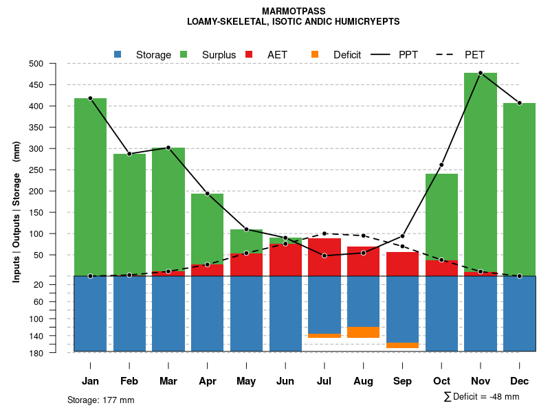 Monthly water balance estimated using a leaky-bucket style model for the MARMOTPASS soil series. Monthly precipitation (PPT) and potential evapotranspiration (PET) have been estimated from the 50th percentile of gridded values (PRISM 1981-2010) overlapping with the extent of SSURGO map units containing each series as a major component. Monthly PET values were estimated using the method of Thornthwaite (1948). These (and other) climatic parameters are calculated with each SSURGO refresh and provided by the fetchOSD function of the soilDB package. Representative water storage values (“AWC” in the figures) were derived from SSURGO by taking the 50th percentile of profile-total water storage (sum[awc_r * horizon thickness]) for each soil series. Note that this representation of “water storage” is based on the average ability of most plants to extract soil water between 15 bar (“permanent wilting point”) and 1/3 bar (“field capacity”) matric potential. Soil moisture state can be roughly interpreted as “dry” when storage is depleted, “moist” when storage is between 0mm and AWC, and “wet” when there is a surplus. Clearly there are a lot of assumptions baked into this kind of monthly water balance. This is still a work in progress.