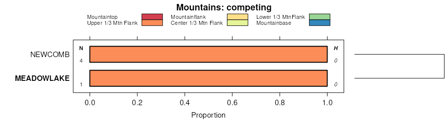 Geomorphic description summaries for the MEADOWLAKE series and competing. Series are sorted according to hierarchical clustering of proportions and relative hydrologic position within an idealized landform (e.g. top to bottom). Proportions can be interpreted as an aggregate representation of geomorphic membership. Most soil series (SSURGO components) are associated with a hillslope position and one or more landform-specific positions: hills, mountain slopes, terraces, and/or flats. The values printed to the left (number of component records) and right (Shannon entropy) of stacked bars can be used to judge the reliability of trends. Shannon entropy values close to 0 represent soil series with relatively consistent geomorphic association, while values close to 1 suggest lack thereof. Source: SSURGO component records .
