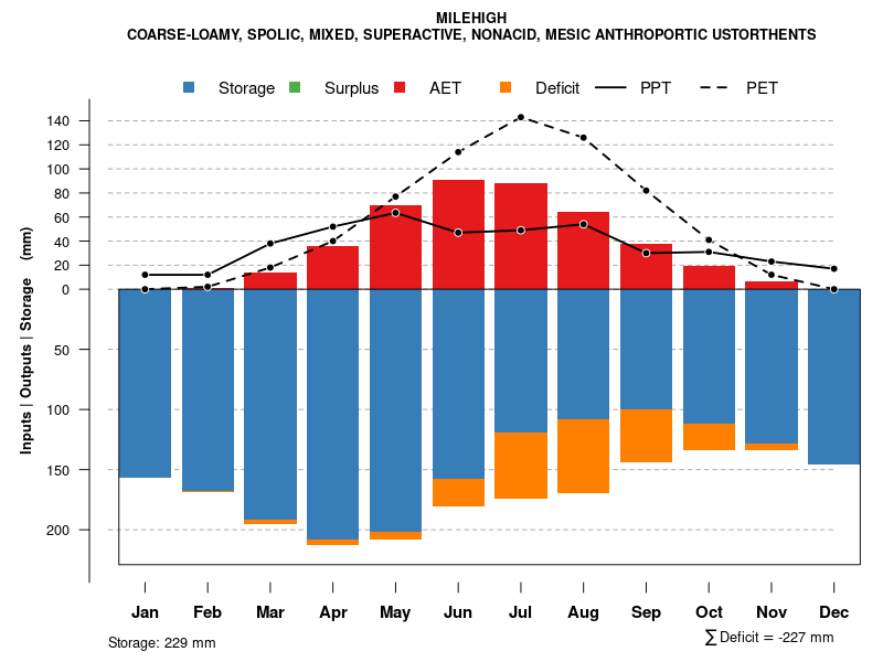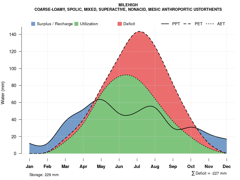 Monthly water balance estimated using a leaky-bucket style model for the MILEHIGH soil series. Monthly precipitation (PPT) and potential evapotranspiration (PET) have been estimated from the 50th percentile of gridded values (PRISM 1981-2010) overlapping with the extent of SSURGO map units containing each series as a major component. Monthly PET values were estimated using the method of Thornthwaite (1948). These (and other) climatic parameters are calculated with each SSURGO refresh and provided by the fetchOSD function of the soilDB package. Representative water storage values (“AWC” in the figures) were derived from SSURGO by taking the 50th percentile of profile-total water storage (sum[awc_r * horizon thickness]) for each soil series. Note that this representation of “water storage” is based on the average ability of most plants to extract soil water between 15 bar (“permanent wilting point”) and 1/3 bar (“field capacity”) matric potential. Soil moisture state can be roughly interpreted as “dry” when storage is depleted, “moist” when storage is between 0mm and AWC, and “wet” when there is a surplus. Clearly there are a lot of assumptions baked into this kind of monthly water balance. This is still a work in progress.