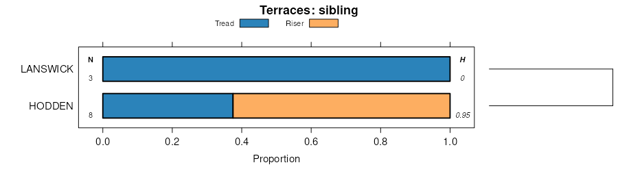 Geomorphic description summaries for the MONAHAN series and siblings. Series are sorted according to hierarchical clustering of proportions and relative hydrologic position within an idealized landform (e.g. top to bottom). Most soil series (SSURGO components) are associated with a hillslope position and one or more landform-specific positions: hills, mountain slopes, terraces, and/or flats. Proportions can be interpreted as an aggregate representation of geomorphic membership. The values printed to the left (number of component records) and right (Shannon entropy) of stacked bars can be used to judge the reliability of trends. Small Shannon entropy values suggest relatively consistent geomorphic association, while larger values suggest lack thereof. Source: SSURGO component records .